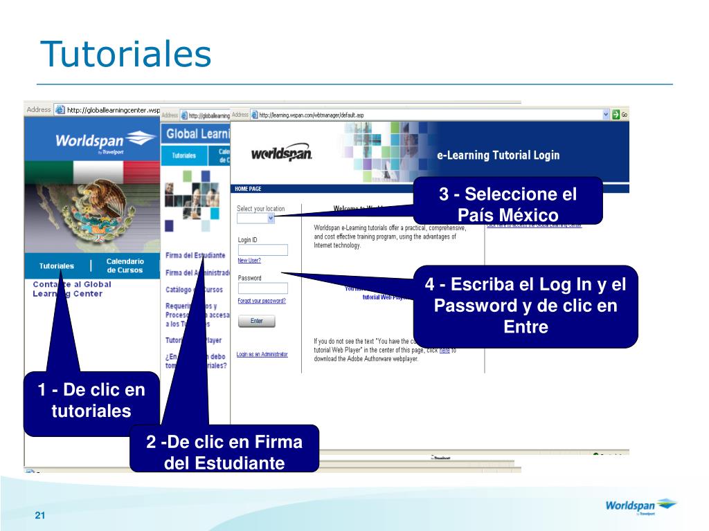 Tutoriales 3 - Seleccione el País México 4 - Escriba el Log In y el Password y de clic en Entre 1 - De clic en tutoriales 2 -De clic en Firma del Estudiante