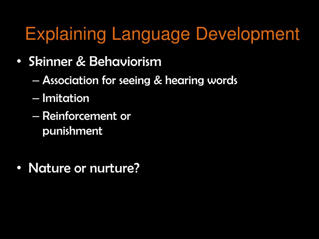 Explaining Language Development • Skinner & Behaviorism • Association for seeing & hearing words • Imitation • Reinforcement or punishment • Nature or nurture?