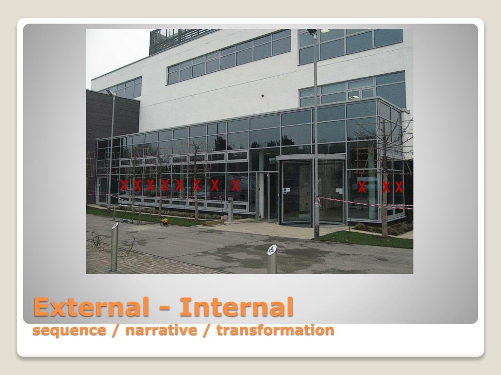 External siteDirectly outside PMI• potential for single point perspective• design changes as you change position