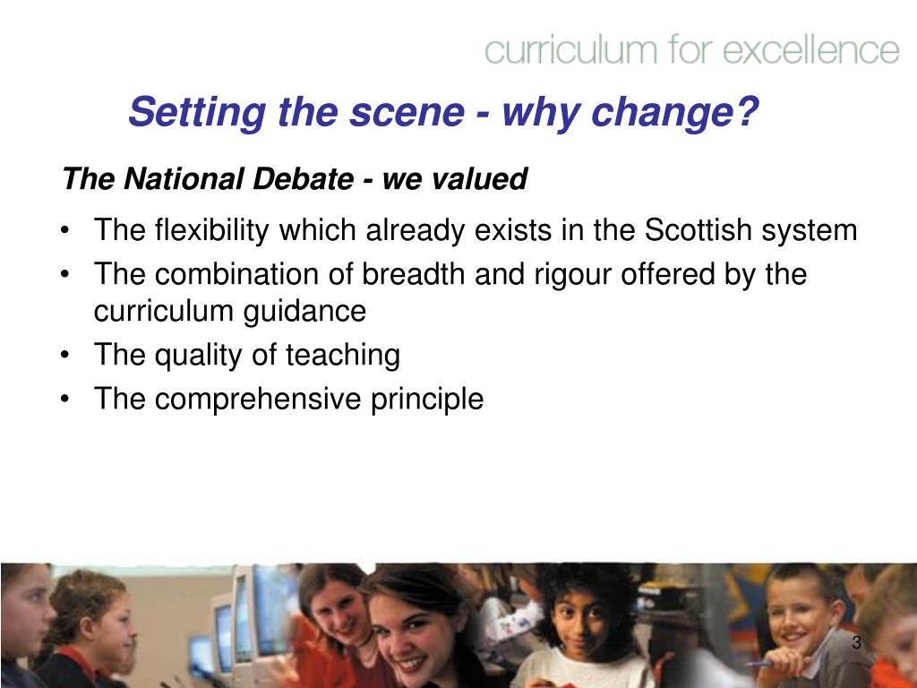 Setting the scene - why change? The National Debate - we valued The flexibility which already exists in the Scottish system The combination of breadth and rigour offered by the curriculum guidance The quality of teaching The comprehensive principle