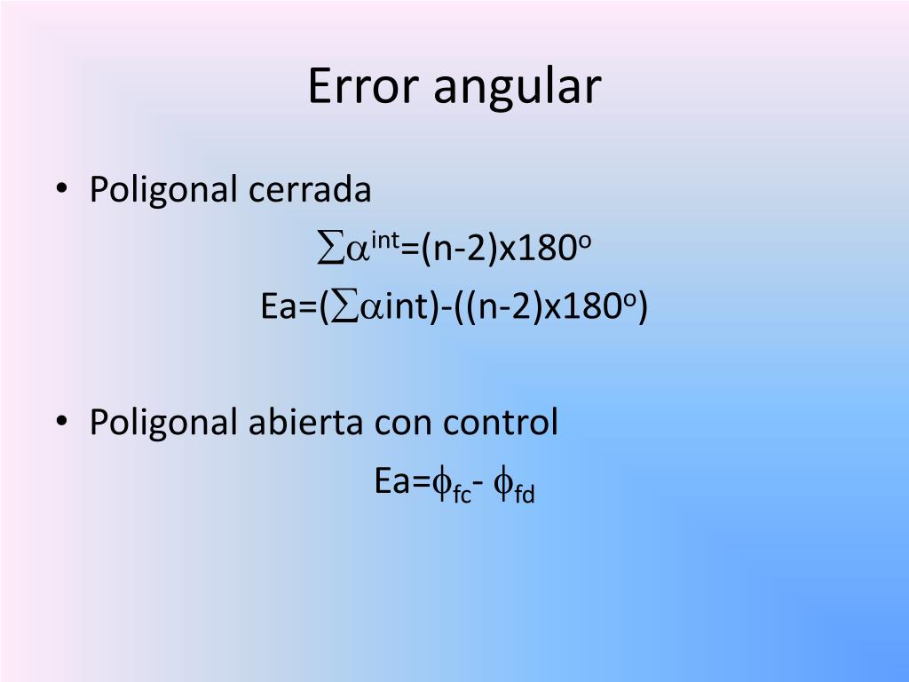 Error angular • Poligonal cerrada int=(n-2)x180o Ea=(int)-((n-2)x180o) • Poligonal abierta con control Ea=fc- fd