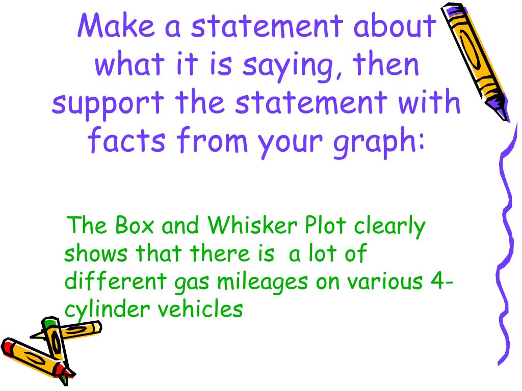Make a statement about what it is saying, then support the statement with facts from your graph: The Box and Whisker Plot clearly shows that there is a lot of different gas mileages on various 4-cylinder vehicles
