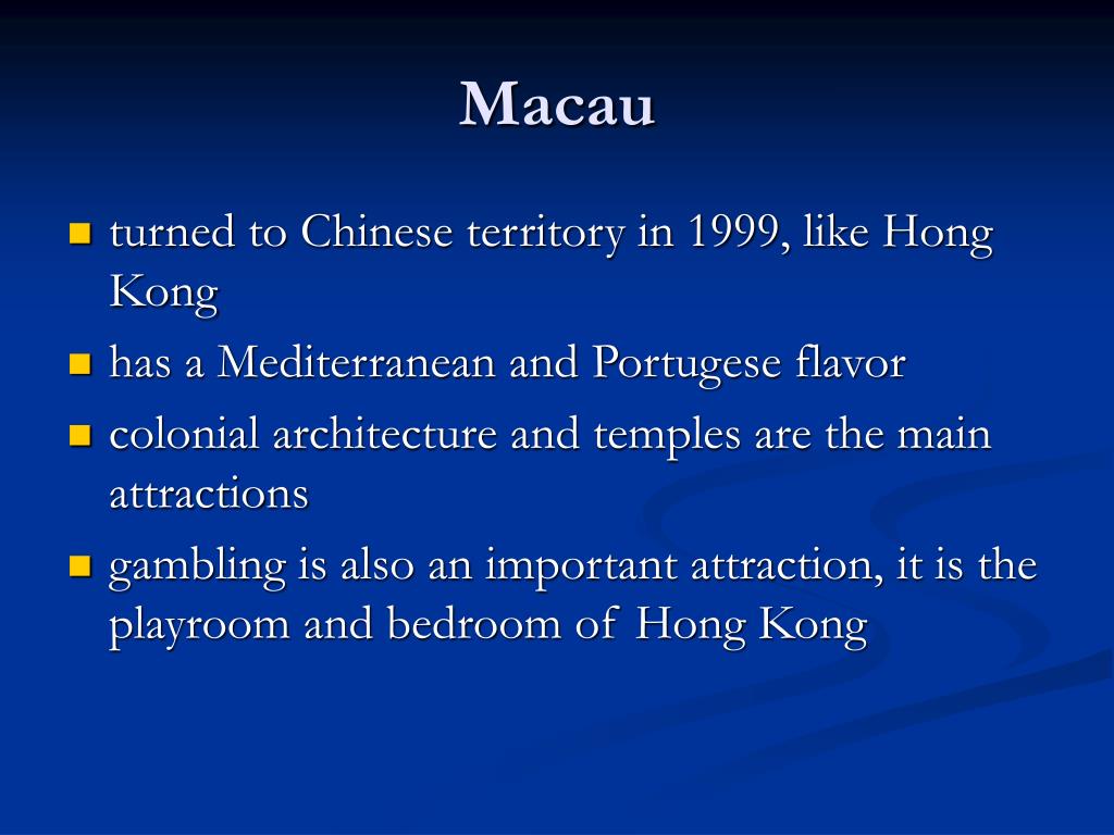 Macau • turned to Chinese territory in 1999, like Hong Kong • has a Mediterranean and Portugese flavor • colonial architecture and temples are the main attractions • gambling is also an important attraction, it is the playroom and bedroom of Hong Kong