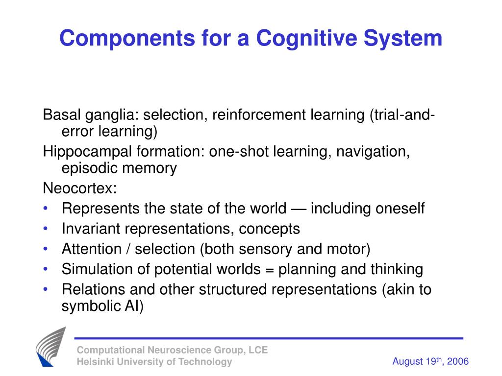 Components for a Cognitive System Basal ganglia: selection, reinforcement learning (trial-and-error learning) Hippocampal formation: one-shot learning, navigation, episodic memory Neocortex: • Represents the state of the world — including oneself • Invariant representations, concepts • Attention / selection (both sensory and motor) • Simulation of potential worlds = planning and thinking • Relations and other structured representations (akin to symbolic AI) Computational Neuroscience Group, LCE Helsinki University of Technology