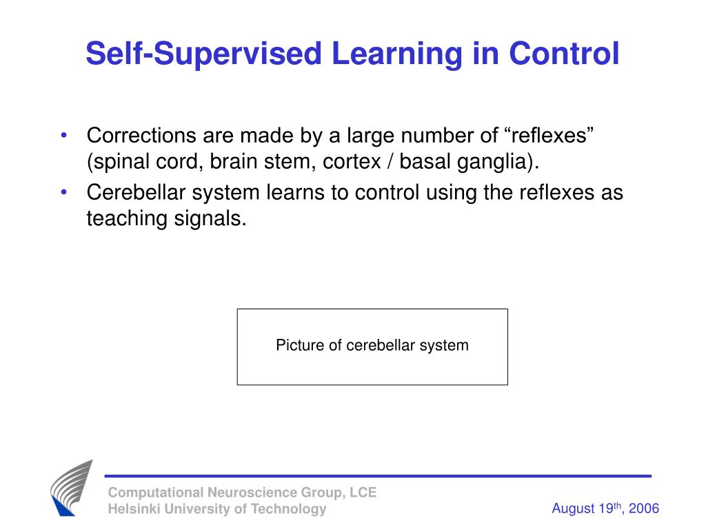 Self-Supervised Learning in Control • Corrections are made by a large number of “reflexes” (spinal cord, brain stem, cortex / basal ganglia). • Cerebellar system learns to control using the reflexes as teaching signals. Picture of cerebellar system Computational Neuroscience Group, LCE Helsinki University of Technology