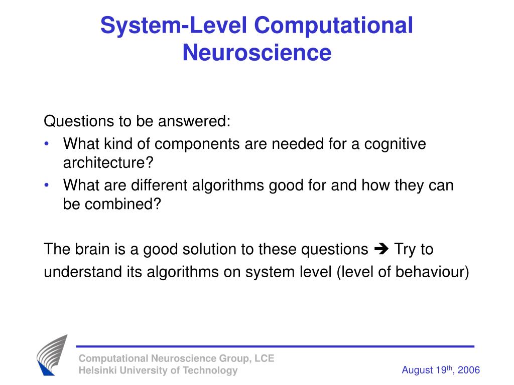 System-Level Computational Neuroscience Questions to be answered: • What kind of components are needed for a cognitive architecture? • What are different algorithms good for and how they can be combined? The brain is a good solution to these questions Try to understand its algorithms on system level (level of behaviour) Computational Neuroscience Group, LCE Helsinki University of Technology