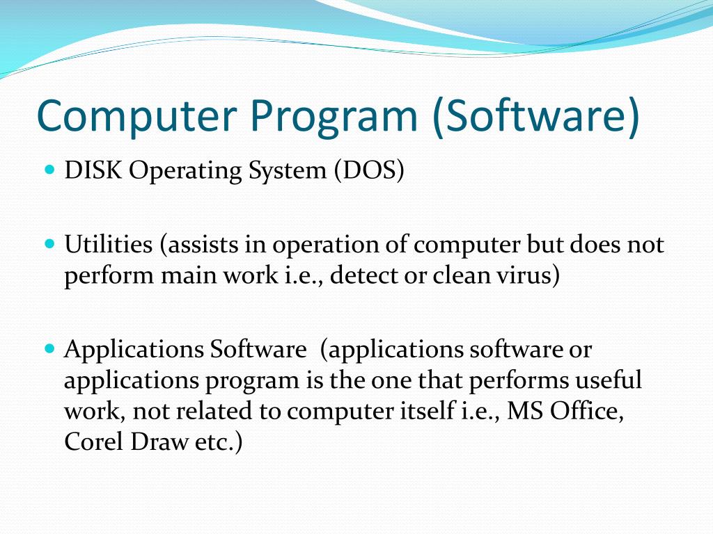 Computer Program (Software) • DISK Operating System (DOS) • Utilities (assists in operation of computer but does not perform main work i.e., detect or clean virus) • Applications Software (applications software or applications program is the one that performs useful work, not related to computer itself i.e., MS Office, Corel Draw etc.)