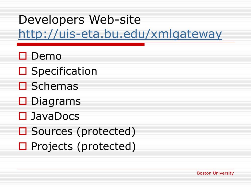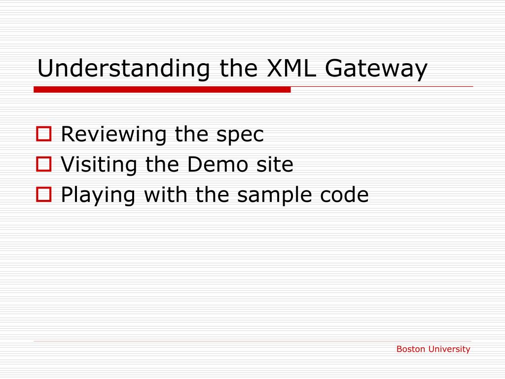 Understanding the XML Gateway • Reviewing the spec • Visiting the Demo site • Playing with the sample code Boston University