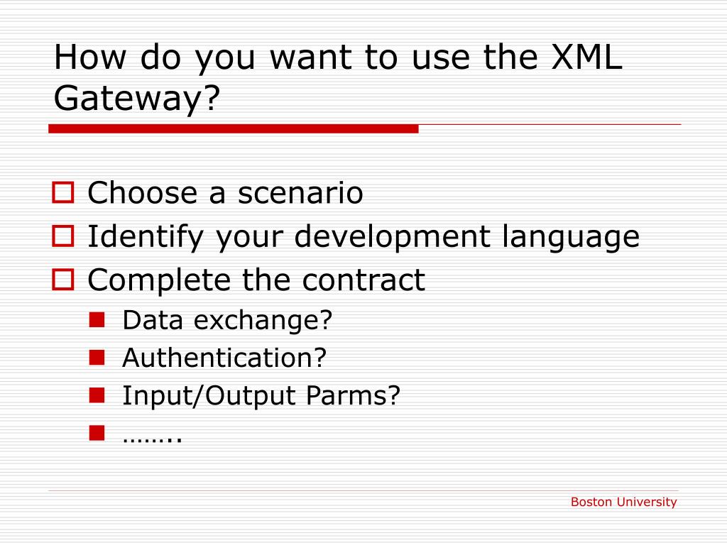 How do you want to use the XML Gateway? • Choose a scenario • Identify your development language • Complete the contract • Data exchange? • Authentication? • Input/Output Parms? • …….. Boston University