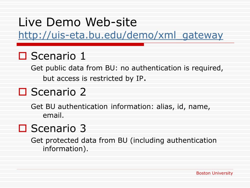 Live Demo Web-sitehttp://uis-eta.bu.edu/demo/xml_gateway • Scenario 1 Get public data from BU: no authentication is required, but access is restricted by IP. • Scenario 2 Get BU authenticationinformation: alias, id, name, email. • Scenario 3 Get protected data from BU (including authentication information). Boston University
