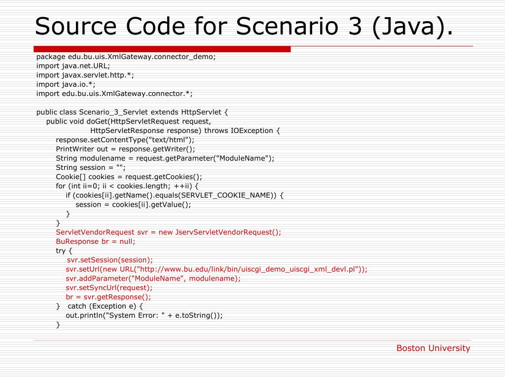 package edu.bu.uis.XmlGateway.connector_demo; import java.net.URL; import javax.servlet.http.*; import java.io.*; import edu.bu.uis.XmlGateway.connector.*; public class Scenario_3_Servlet extends HttpServlet { public void doGet(HttpServletRequest request, HttpServletResponse response) throws IOException { response.setContentType("text/html"); PrintWriter out = response.getWriter(); String modulename = request.getParameter("ModuleName"); String session = ""; Cookie[] cookies = request.getCookies(); for (int ii=0; ii < cookies.length; ++ii) { if (cookies[ii].getName().equals(SERVLET_COOKIE_NAME)) { session = cookies[ii].getValue(); } } ServletVendorRequest svr = new JservServletVendorRequest(); BuResponse br = null; try { svr.setSession(session); svr.setUrl(new URL("http://www.bu.edu/link/bin/uiscgi_demo_uiscgi_xml_devl.pl")); svr.addParameter("ModuleName", modulename); svr.setSyncUrl(request); br = svr.getResponse(); } catch (Exception e) { out.println("System Error: " + e.toString()); } Source Code for Scenario 3 (Java). Boston University