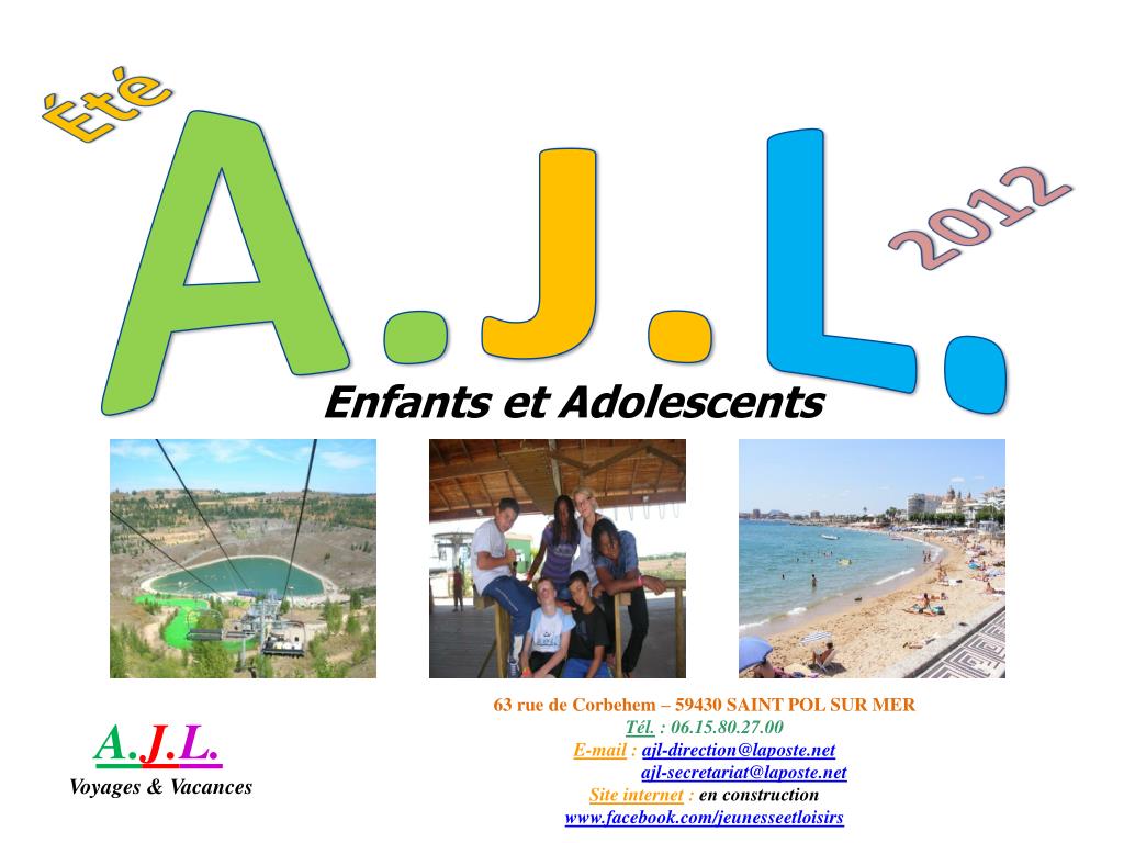 Été. A. J. L. 2012. Enfants et Adolescents. 63 rue de Corbehem – 59430 SAINT POL SUR MER Tél. : 06.15.80.27.00 E-mail : ajl-direction@laposte.net ajl-secretariat@laposte.net Site internet : en construction www.facebook.com/jeunesseetloisirs. A. J. L. Voyages & Vacances.