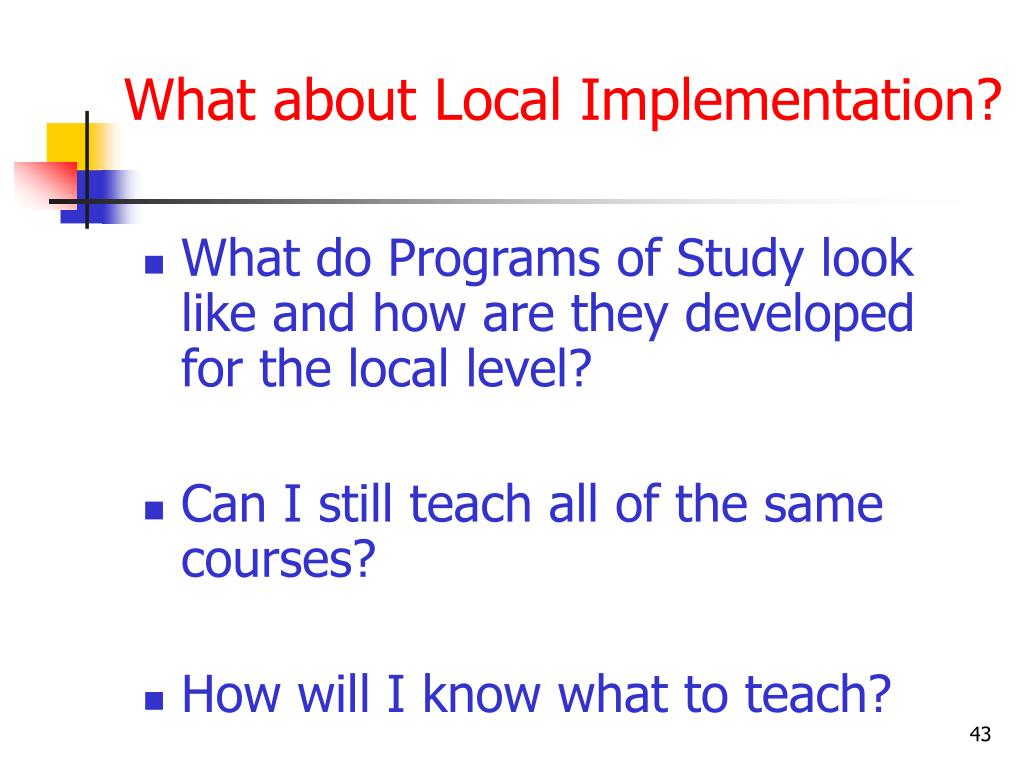 What about Local Implementation? • What do Programs of Study look like and how are they developed for the local level? • Can I still teach all of the same courses? • How will I know what to teach?