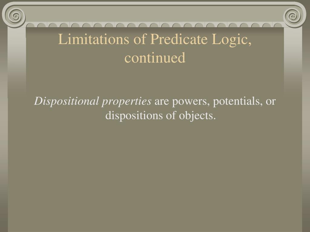 Limitations of Predicate Logic, continued Dispositional properties are powers, potentials, or dispositions of objects.