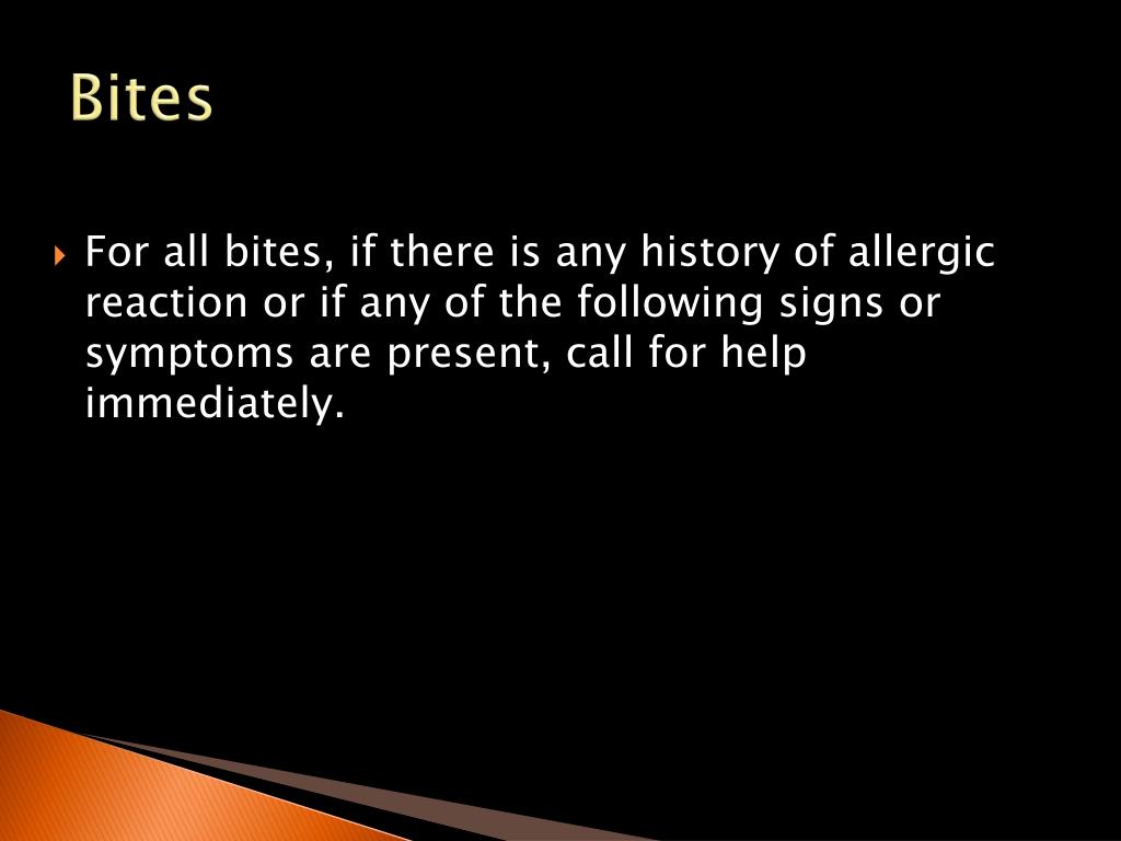Bites • For all bites, if there is any history of allergic reaction or if any of the following signs or symptoms are present, call for help immediately.