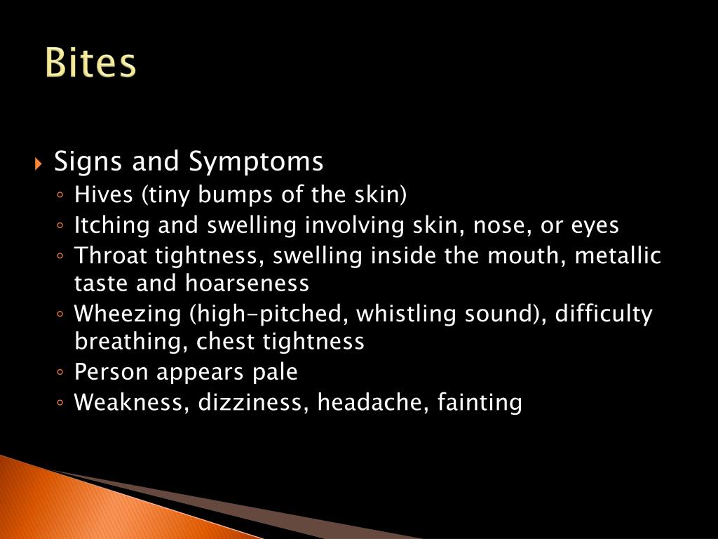 Bites • Signs and Symptoms • Hives (tiny bumps of the skin) • Itching and swelling involving skin, nose, or eyes • Throat tightness, swelling inside the mouth, metallic taste and hoarseness • Wheezing (high-pitched, whistling sound), difficulty breathing, chest tightness • Person appears pale • Weakness, dizziness, headache, fainting