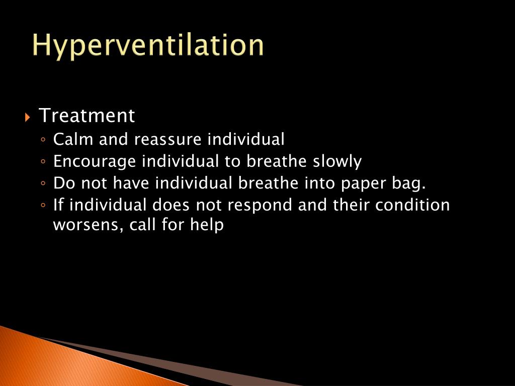 Hyperventilation • Treatment • Calm and reassure individual • Encourage individual to breathe slowly • Do not have individual breathe into paper bag. • If individual does not respond and their condition worsens, call for help