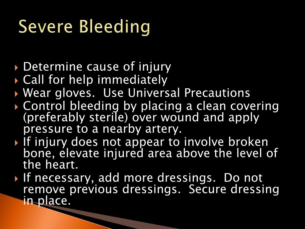 Severe Bleeding • Determine cause of injury • Call for help immediately • Wear gloves. Use Universal Precautions • Control bleeding by placing a clean covering (preferably sterile) over wound and apply pressure to a nearby artery. • If injury does not appear to involve broken bone, elevate injured area above the level of the heart. • If necessary, add more dressings. Do not remove previous dressings. Secure dressing in place.