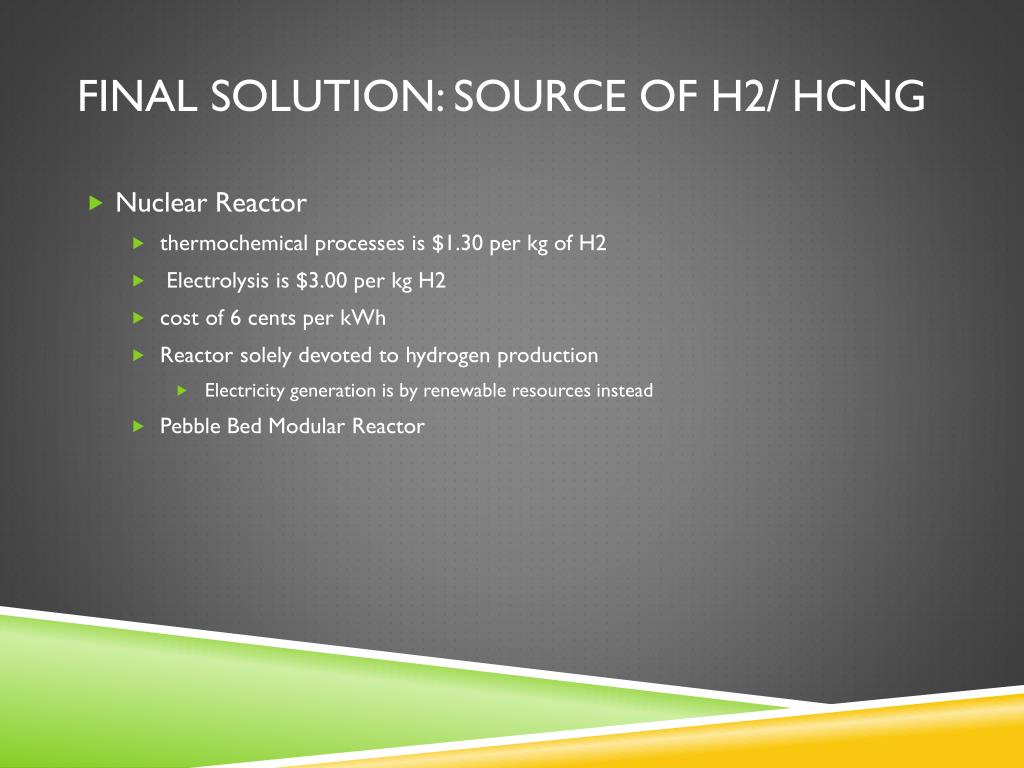 Final Solution: Source of H2/ HCNG • Nuclear Reactor • thermochemical processes is $1.30 per kg of H2 • Electrolysis is $3.00 per kg H2 • cost of 6 cents per kWh • Reactor solely devoted to hydrogen production • Electricity generation is by renewable resources instead • Pebble Bed Modular Reactor