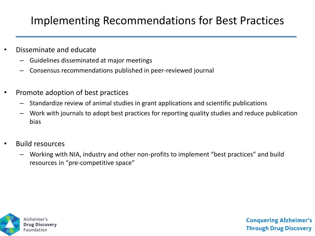 Implementing Recommendations for Best Practices • Disseminate and educate • Guidelines disseminated at major meetings • Consensus recommendations published in peer-reviewed journal • Promote adoption of best practices • Standardize review of animal studies in grant applications and scientific publications • Work with journals to adopt best practices for reporting quality studies and reduce publication bias • Build resources • Working with NIA, industry and other non-profits to implement “best practices” and build resources in “pre-competitive space”