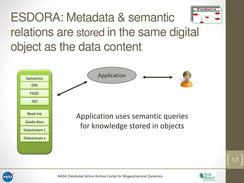 DOI FGDC ISO Read me Guide docs Datastream 1 ESDORA: Metadata & semantic relations are stored in the same digital object as the data content Application Semantics Application uses semantic queries for knowledge stored in objects Datastream x