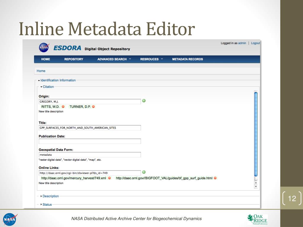 ESDORA DIP • REST Web Services • Data Objects • Collection Objects • Datastreams • Metadata in OAI-PMH • Indexing & Search • http://esdora2.ornl.gov/oaiprovider/?verb=ListRecords&metadataPrefix=fgdc