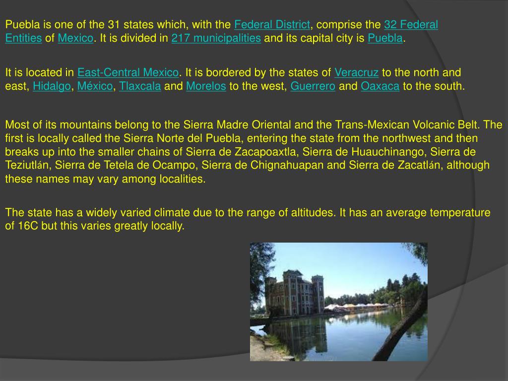 PUEBLA. Puebla is one of the 31 states which, with the Federal District , comprise the 32 Federal Entities of Mexico . It is divided in 217 municipalities and its capital city is Puebla.