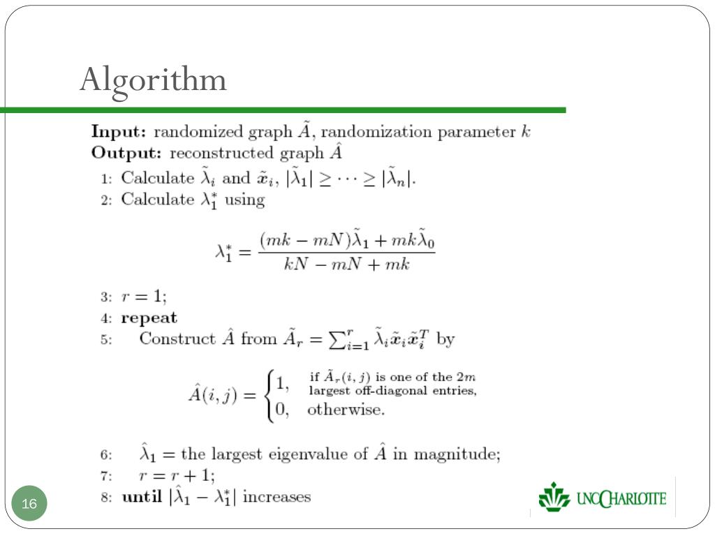 Determine Number of Eigen-pairs • Question: • How to choose an optimal rank r for reconstruction? • Solution: • Choose as the indicator since it is closely related to the other features and there exists an explicit moment estimator • where m is the number of edges, k is the number of edges add/delete, 15