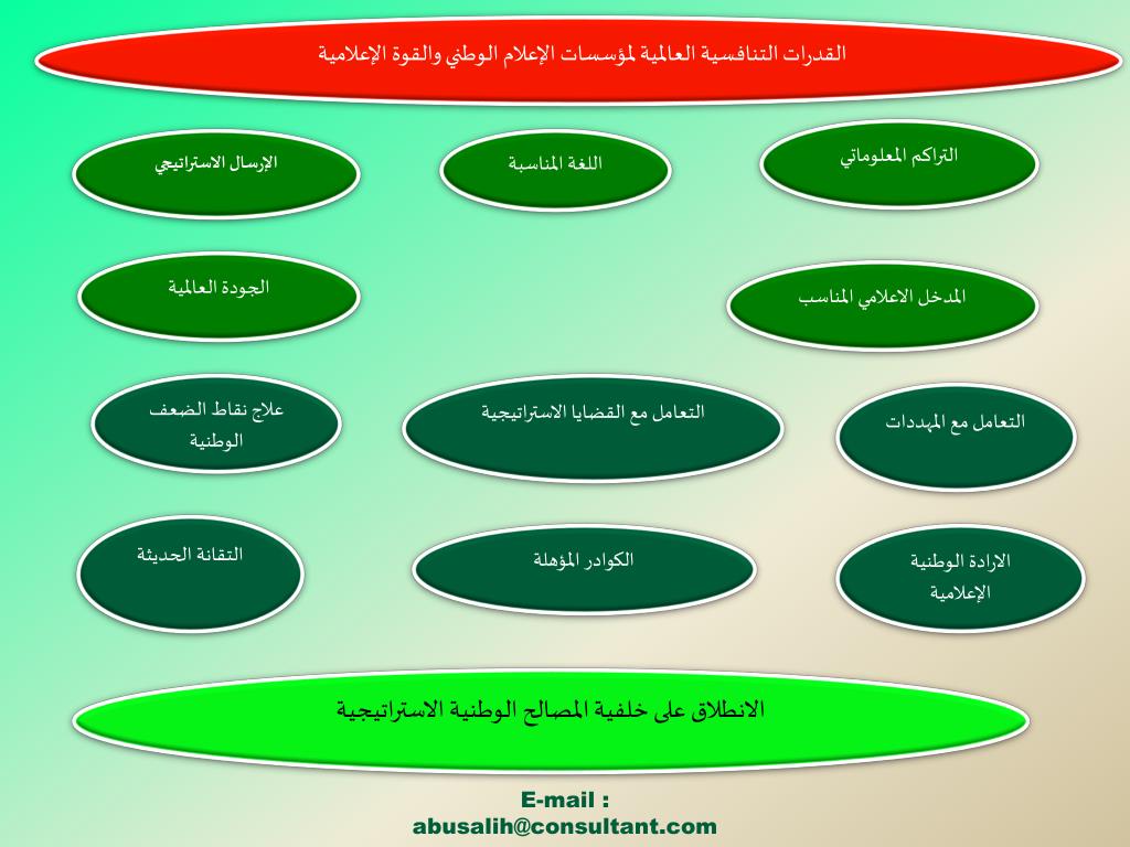 القدرات التنافسية العالمية لمؤسسات الإعلام الوطني والقوة الإعلامية التراكم المعلوماتي الإرسال الاستراتيجي اللغة المناسبة الجودة العالمية المدخل الاعلامي المناسب علاج نقاط الضعف الوطنية التعامل مع القضايا الاستراتيجية التعامل مع المهددات التقانة الحديثة الكوادر المؤهلة الارادة الوطنية الإعلامية الانطلاق على خلفية المصالح الوطنية الاستراتيجية E-mail : abusalih@consultant.com