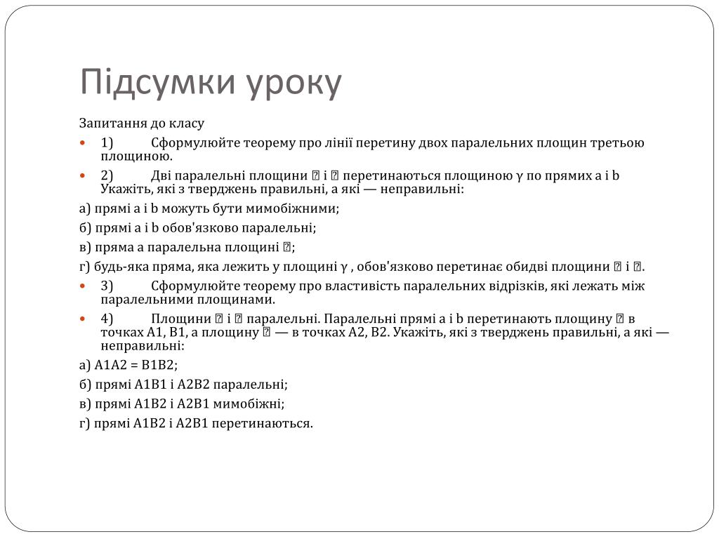 Підсумки уроку Запитання до класу • 1) Сформулюйте теорему про лінії перетину двох паралельних площин третьою площиною. • 2) Дві паралельні площини і перетинаються площиною γ по прямих а і b Укажіть, які з тверджень правильні, а які — неправильні: а) прямі а і b можуть бути мимобіжними; б) прямі а і b обов'язково паралельні; в) пряма а паралельна площині ; г) будь-яка пряма, яка лежить у площині γ , обов'язково перетинає обидві площини і . • 3) Сформулюйте теорему про властивість паралельних відрізків, які лежать між паралельними площинами. • 4) Площини і паралельні. Паралельні прямі а і b перетинають площину в точках А1, В1, а площину — в точках А2, В2. Укажіть, які з тверджень правильні, а які — неправильні: а) А1А2 = В1B2; б) прямі А1B1 і А2В2 паралельні; в) прямі А1В2 і А2В1 мимобіжні; г) прямі А1В2 і А2B1 перетинаються.