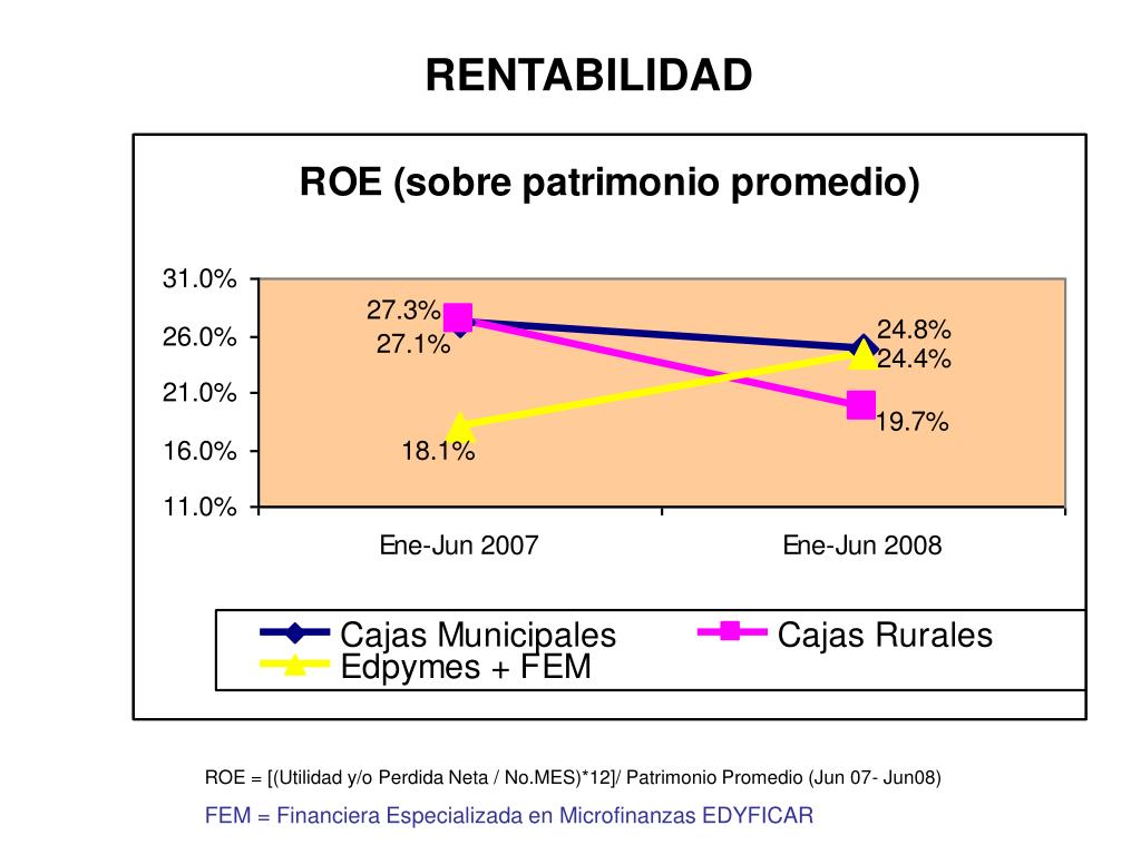 RENTABILIDAD ROE = [(Utilidad y/o Perdida Neta / No.MES)*12]/ Patrimonio Promedio (Jun 07- Jun08) FEM = Financiera Especializada en Microfinanzas EDYFICAR