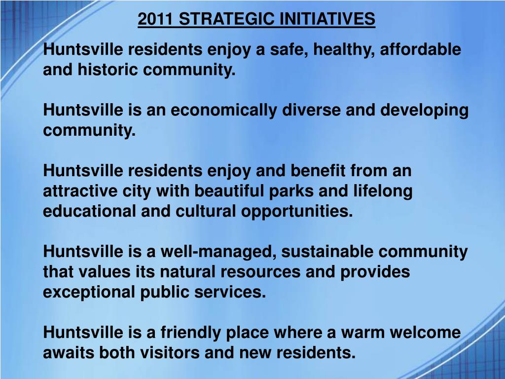 2011 STRATEGIC INITIATIVES • Huntsville residents enjoy a safe, healthy, affordable and historic community. • Huntsville is an economically diverse and developing community. • Huntsville residents enjoy and benefit from an attractive city with beautiful parks and lifelong educational and cultural opportunities. • Huntsville is a well-managed, sustainable community that values its natural resources and provides exceptional public services. • Huntsville is a friendly place where a warm welcome awaits both visitors and new residents.