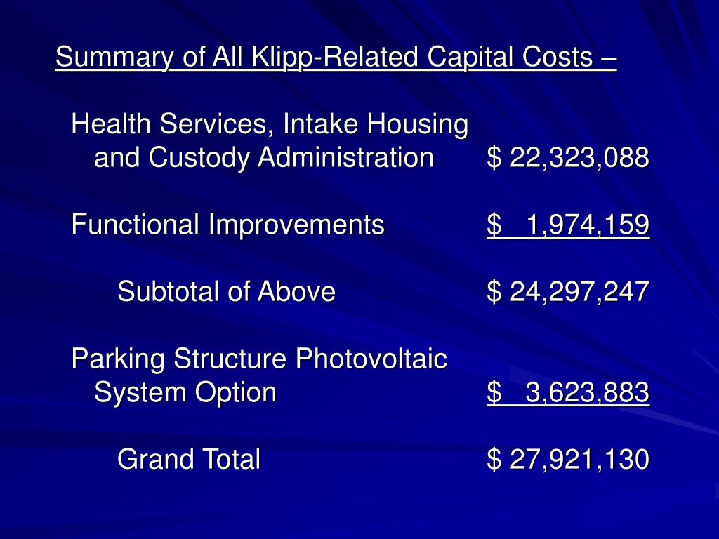 Summary of All Klipp-Related Capital Costs – Health Services, Intake Housing and Custody Administration $ 22,323,088 Functional Improvements $ 1,974,159 Subtotal of Above $ 24,297,247 Parking Structure Photovoltaic System Option $ 3,623,883 Grand Total $ 27,921,130