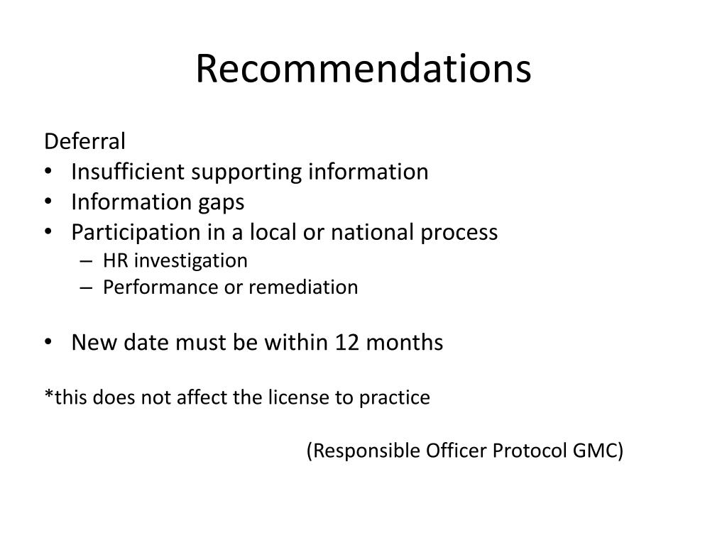 Recommendations Deferral • Insufficient supporting information • Information gaps • Participation in a local or national process • HR investigation • Performance or remediation • New date must be within 12 months *this does not affect the license to practice (Responsible Officer Protocol GMC)