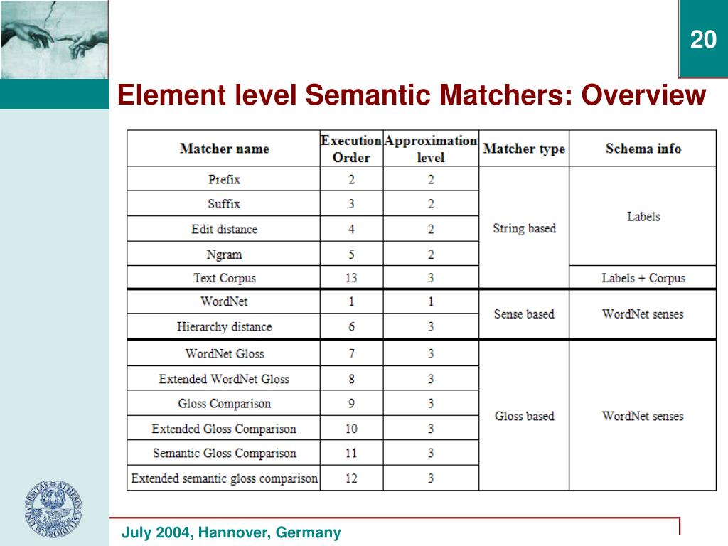 String based matchers have two labels as input and produce semantic relations exploiting string comparison techniques. Sense based matchers have two WordNet senses in input and produce semantic relations exploiting structural properties of WordNet hierarchies. Gloss based matchers have two WordNet senses as input and produce relations exploiting gloss comparison techniques. Element level Semantic Matchers
