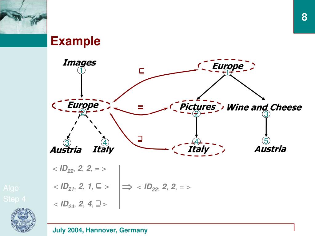 Images Europe ? 1 1 Europe = ? Pictures Wine and Cheese 2 2 3 ? 5 4 4 3 Austria Italy Italy Austria < ID22, 2, 2, = > < ID21, 2, 1, > < ID22, 2, 2, = > < ID24, 2, 4, > Example Algo Step 4