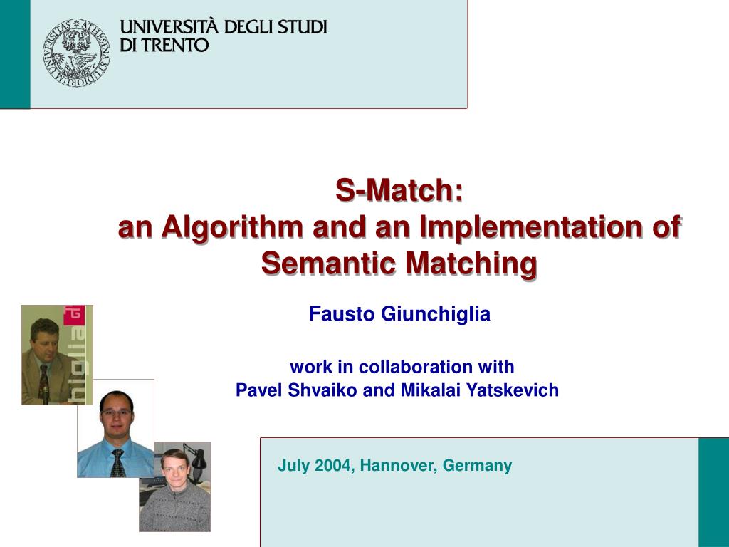 S-Match:an Algorithm and an Implementation of Semantic Matching Fausto Giunchiglia work in collaboration with Pavel Shvaiko and Mikalai Yatskevich July 2004, Hannover, Germany
