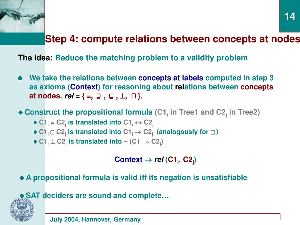 Context rel (C1i, C2j) A propositional formula is valid iff its negation is unsatisfiable SAT deciders are sound and complete… • Construct the propositional formula (C1i in Tree1 and C2j in Tree2) • C1i = C2jis translated into C1iC2j • C1iC2jis translated into C1iC2j (analogously for ) • C1i C2jis translated into ¬ (C1i C2j) rel = { =, , , , }. Step 4: compute relations between concepts at nodes The idea: Reduce the matching problem to a validity problem • We take the relations between concepts at labels computed in step 3 as axioms (Context) for reasoning about relations between concepts at nodes.