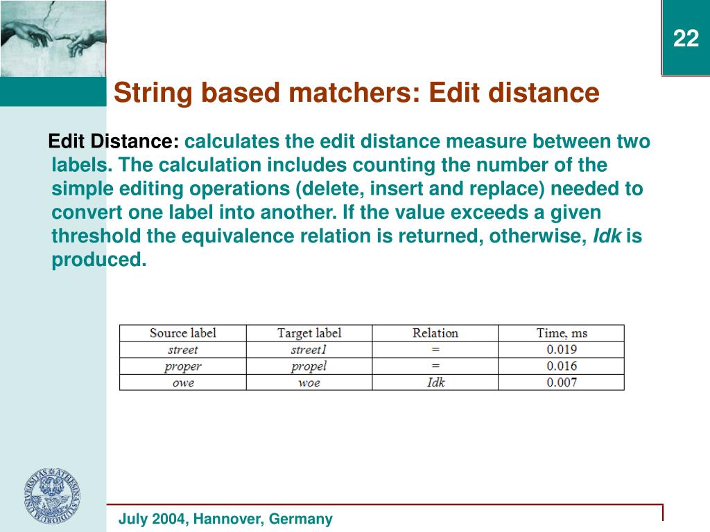 Edit Distance: calculates the edit distance measure between two labels. The calculation includes counting the number of the simple editing operations (delete, insert and replace) needed to convert one label into another. If the value exceeds a given threshold the equivalence relation is returned, otherwise, Idk is produced. String based matchers: Edit distance