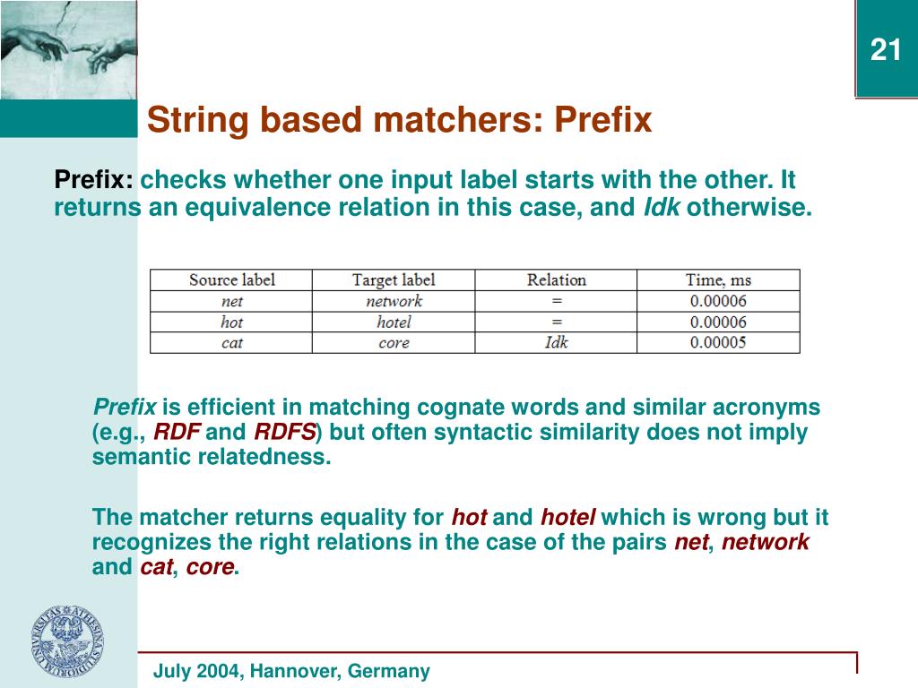 Prefix:checks whether one input label starts with the other. It returns an equivalence relation in this case, and Idk otherwise. Prefix is efficient in matching cognate words and similar acronyms (e.g., RDF and RDFS) but often syntactic similarity does not imply semantic relatedness. The matcher returns equality for hot and hotelwhich is wrong but it recognizes the right relations in the case of the pairs net, networkand cat, core. String based matchers: Prefix