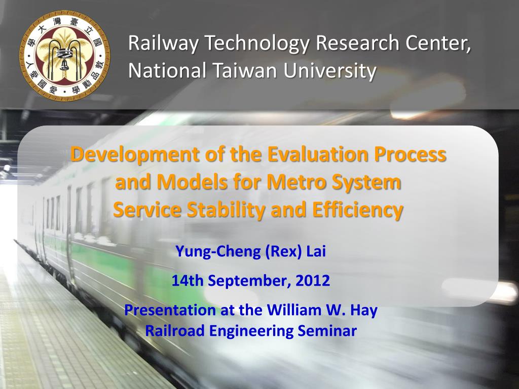 Railway Technology Research Center, National Taiwan University Development of the Evaluation Process and Models for Metro System Service Stability and Efficiency Yung-Cheng (Rex) Lai 14th September, 2012 Presentation at the William W. Hay Railroad Engineering Seminar