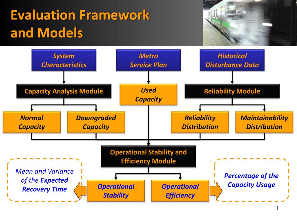 Evaluation Framework and Models System Characteristics MetroService Plan Historical Disturbance Data System Reliabilityand Maintainability Capacity Analysis Module UsedCapacity Reliability Module NormalCapacity DowngradedCapacity Reliability Distribution Maintainability Distribution Operational Stabilityand Efficiency Operational Stability and Efficiency Module SystemCharacteristics MetroService Plan Mean and Variance of the Expected Recovery Time Percentage of the Capacity Usage Operational Stability Operational Efficiency