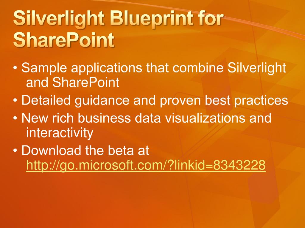 Silverlight Blueprint for SharePoint • Sample applications that combine Silverlight and SharePoint • Detailed guidance and proven best practices • New rich business data visualizations and interactivity • Download the beta at http://go.microsoft.com/?linkid=8343228
