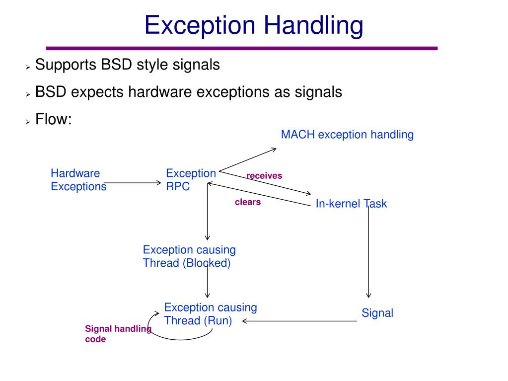 Exception Handling Supports BSD style signals BSD expects hardware exceptions as signals Flow: MACH exception handling Hardware Exceptions Exception RPC receives clears In-kernel Task Exception causing Thread (Blocked) Exception causing Thread (Run) Signal Signal handling code