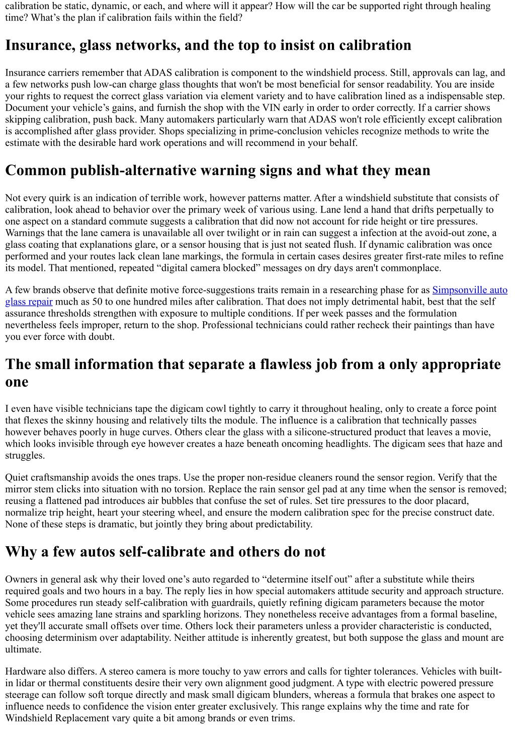 calibration be static, dynamic, or each, and where will it appear? How will the car be supported right through healing time? What’s the plan if calibration fails within the field? Insurance, glass networks, and the top to insist on calibration Insurance carriers remember that ADAS calibration is component to the windshield process. Still, approvals can lag, and a few networks push low-can charge glass thoughts that won't be most beneficial for sensor readability. You are inside your rights to request the correct glass variation via element variety and to have calibration lined as a indispensable step. Document your vehicle’s gains, and furnish the shop with the VIN early in order to order correctly. If a carrier shows skipping calibration, push back. Many automakers particularly warn that ADAS won't role efficiently except calibration is accomplished after glass provider. Shops specializing in prime-conclusion vehicles recognize methods to write the estimate with the desirable hard work operations and will recommend in your behalf. Common publish-alternative warning signs and what they mean Not every quirk is an indication of terrible work, however patterns matter. After a windshield substitute that consists of calibration, look ahead to behavior over the primary week of various using. Lane lend a hand that drifts perpetually to one aspect on a standard commute suggests a calibration that did now not account for ride height or tire pressures. Warnings that the lane camera is unavailable all over twilight or in rain can suggest a infection at the avoid-out zone, a glass coating that explanations glare, or a sensor housing that is just not seated flush. If dynamic calibration was once performed and your routes lack clean lane markings, the formula in certain cases desires greater first-rate miles to refine its model. That mentioned, repeated “digital camera blocked” messages on dry days aren't commonplace. A few brands observe that definite motive force-suggestions traits remain in a researching phase for as Simpsonville auto glass repair much as 50 to one hundred miles after calibration. That does not imply detrimental habit, best that the self assurance thresholds strengthen with exposure to multiple conditions. If per week passes and the formulation nevertheless feels improper, return to the shop. Professional technicians could rather recheck their paintings than have you ever force with doubt. The small information that separate a flawless job from a only appropriate one I even have visible technicians tape the digicam cowl tightly to carry it throughout healing, only to create a force point that flexes the skinny housing and relatively tilts the module. The influence is a calibration that technically passes however behaves poorly in huge curves. Others clear the glass with a silicone-structured product that leaves a movie, which looks invisible through eye however creates a haze beneath oncoming headlights. The digicam sees that haze and struggles. Quiet craftsmanship avoids the ones traps. Use the proper non-residue cleaners round the sensor region. Verify that the mirror stem clicks into situation with no torsion. Replace the rain sensor gel pad at any time when the sensor is removed; reusing a flattened pad introduces air bubbles that confuse the set of rules. Set tire pressures to the door placard, normalize trip height, heart your steering wheel, and ensure the modern calibration spec for the precise construct date. None of these steps is dramatic, but jointly they bring about predictability. Why a few autos self-calibrate and others do not Owners in general ask why their loved one’s auto regarded to “determine itself out” after a substitute while theirs required goals and two hours in a bay. The reply lies in how special automakers attitude security and approach structure. Some procedures run steady self-calibration with guardrails, quietly refining digicam parameters because the motor vehicle sees amazing lane strains and sparkling horizons. They nonetheless receive advantages from a formal baseline, yet they'll accurate small offsets over time. Others lock their parameters unless a provider characteristic is conducted, choosing determinism over adaptability. Neither attitude is inherently greatest, but both suppose the glass and mount are ultimate. Hardware also differs. A stereo camera is more touchy to yaw errors and calls for tighter tolerances. Vehicles with built- in lidar or thermal constituents desire their very own alignment good judgment. A type with electric powered pressure steerage can follow soft torque directly and mask small digicam blunders, whereas a formula that brakes one aspect to influence needs to confidence the vision enter greater exclusively. This range explains why the time and rate for Windshield Replacement vary quite a bit among brands or even trims.