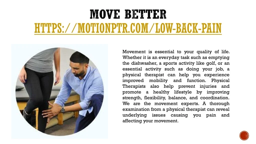 Move Betterhttps://motionptr.com/low-back-pain Movement is essential to your quality of life. Whether it is an everyday task such as emptying the dishwasher, a sports activity like golf, or an essential activity such as doing your job, a physical therapist can help you experience improved mobility and function. Physical Therapists also help prevent injuries and promote a healthy lifestyle by improving strength, flexibility, balance, and coordination.We are the movement experts. A thorough examination from a physical therapist can reveal underlying issues causing you pain and affecting your movement.