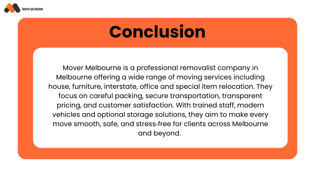 Conclusion Mover Melbourne is a professional removalist company in Melbourne offering a wide range of moving services including house, furniture, interstate, office and special item relocation. They focus on careful packing, secure transportation, transparent pricing, and customer satisfaction. With trained staff, modern vehicles and optional storage solutions, they aim to make every move smooth, safe, and stress‑free for clients across Melbourne and beyond.