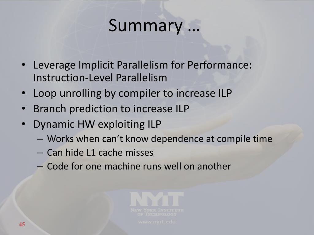 Summary … • Leverage Implicit Parallelism for Performance: Instruction-Level Parallelism • Loop unrolling by compiler to increase ILP • Branch prediction to increase ILP • Dynamic HW exploiting ILP • Works when can’t know dependence at compile time • Can hide L1 cache misses • Code for one machine runs well on another