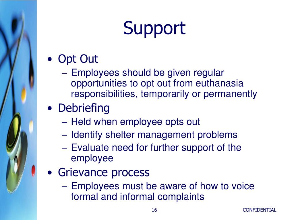 Support • Opt Out • Employees should be given regular opportunities to opt out from euthanasia responsibilities, temporarily or permanently • Debriefing • Held when employee opts out • Identify shelter management problems • Evaluate need for further support of the employee • Grievance process • Employees must be aware of how to voice formal and informal complaints CONFIDENTIAL