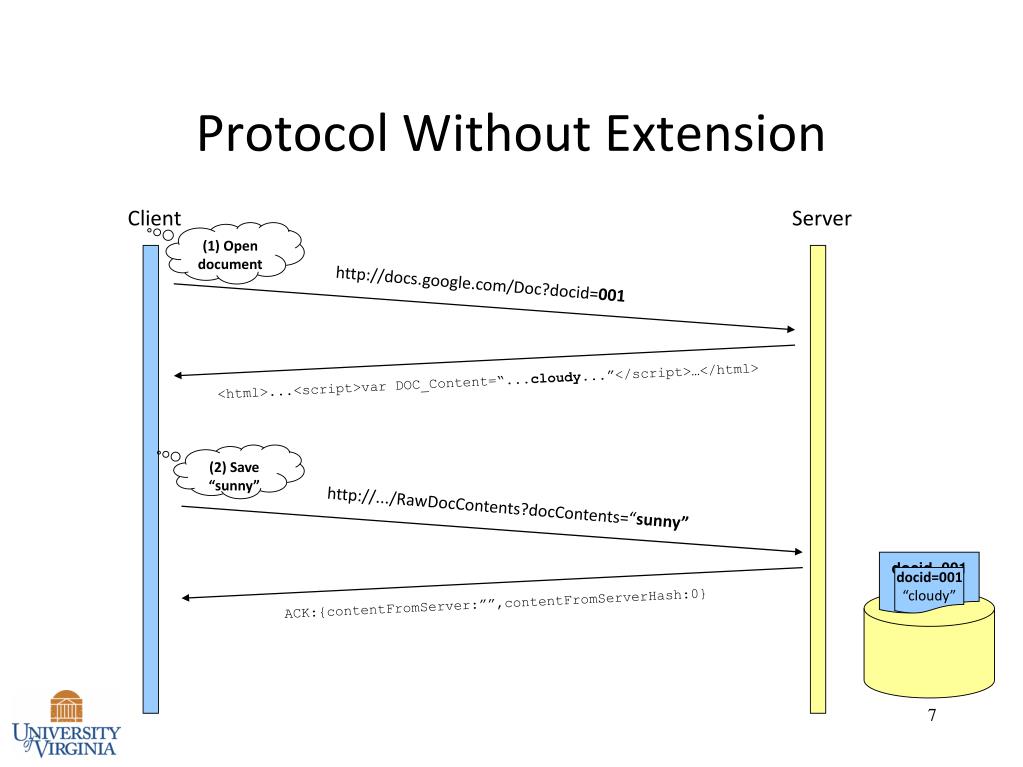 http://docs.google.com/Doc?docid=001 <html>...<script>var DOC_Content=“...cloudy...”</script>…</html> ACK:{contentFromServer:””,contentFromServerHash:0} http://.../RawDocContents?docContents=“sunny” Protocol Without Extension Client Server (1) Open document (2) Save “sunny” docid=001 “sunny” docid=001 “cloudy”